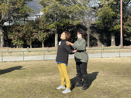 ペアで背中を触ってもらいながら肩甲骨を動かすことで、身体に意識が芽生えます。